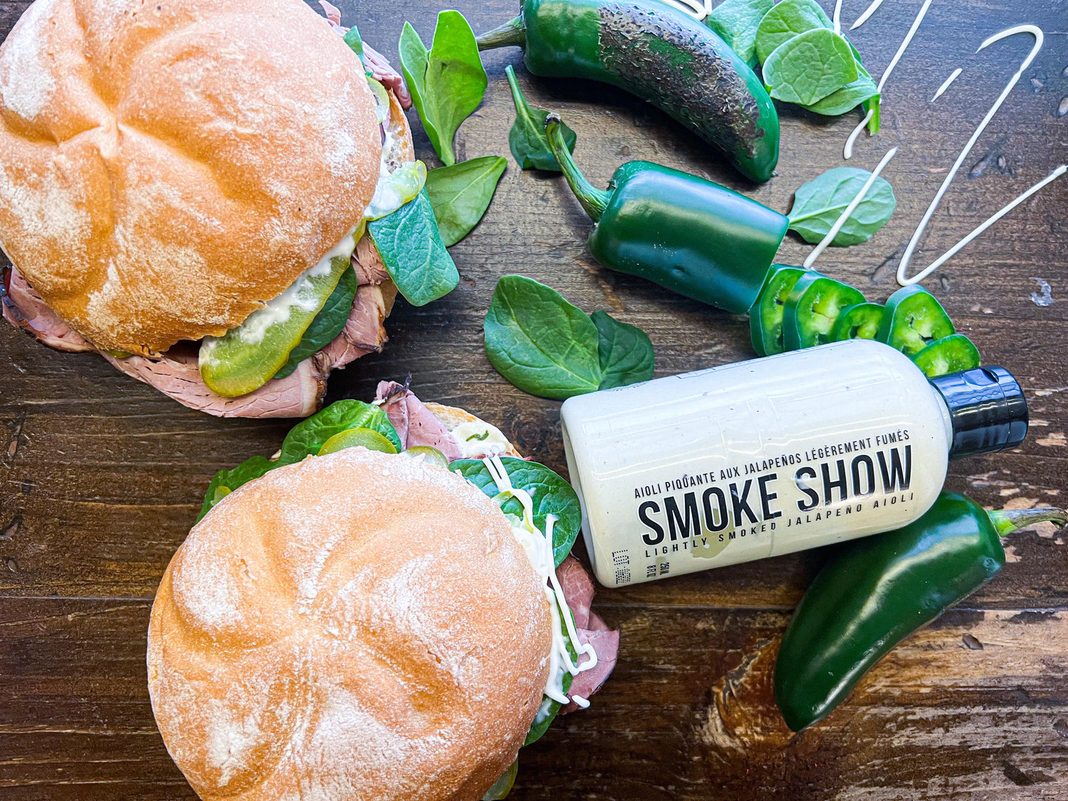 Kaiser bun, smoked jalapeno aioli, pickles, spinach